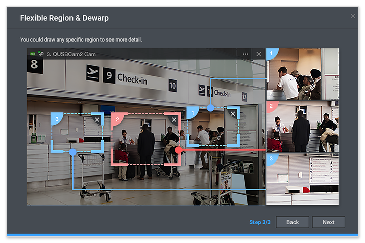 Rejestrowane obszaryFunkcja rejestrowania obszarów umożliwia wyświetlanie wielu obrazów konkretnych obszarów z jednej kamery, zarówno w widoku na żywo, jak i w trybie odtwarzania. Można zdefiniować i powiększyć wiele obszarów, aby dokładniej obserwować obszar.