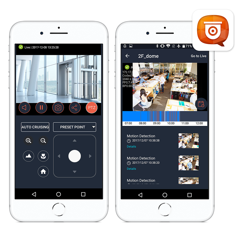 Aplikacja mobilna QVR Pro Client umożliwia zdalne monitorowanie wielu kanałów jednocześnie. Jeśli połączenie z siecią jest wolne lub jest płatne/ograniczone, można wybrać tryb niskiej przepustowości, aby obraz był wyświetlany strumieniowo z zoptymalizowaną przepustowością bez pogorszenia jakości nagrań. Ponadto można zdalnie ustawić zaprogramowany punkt kamery lub sterować kamerami PTZ w aplikacji.